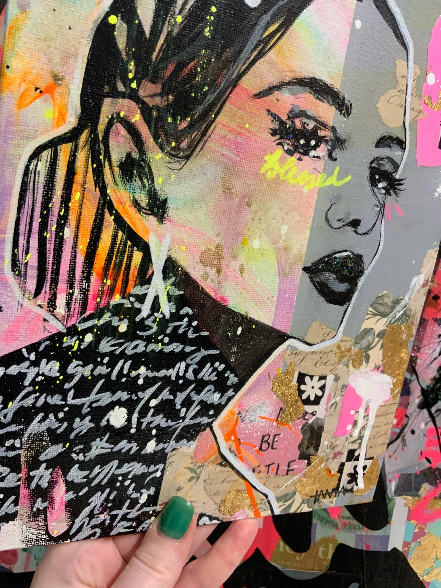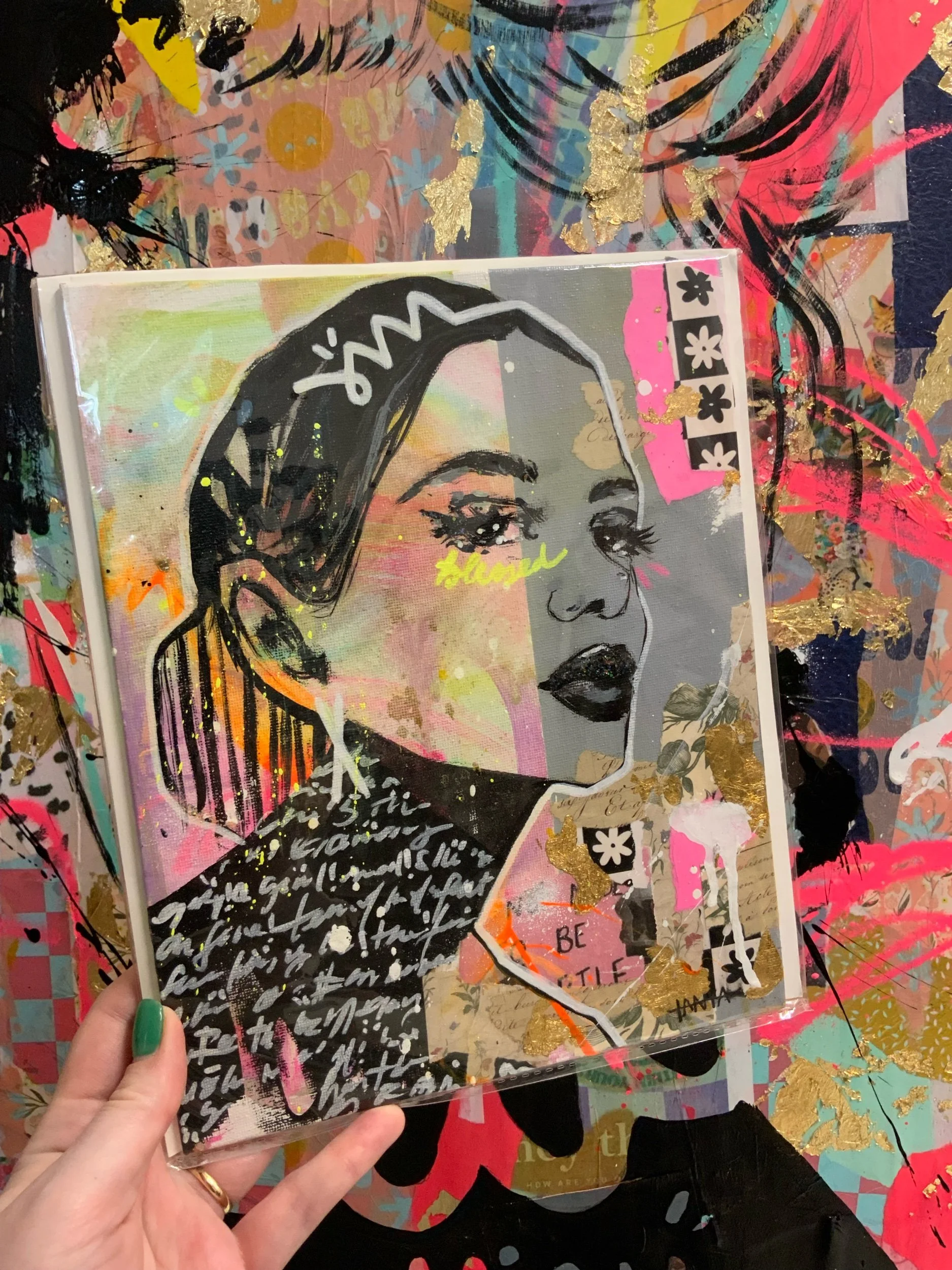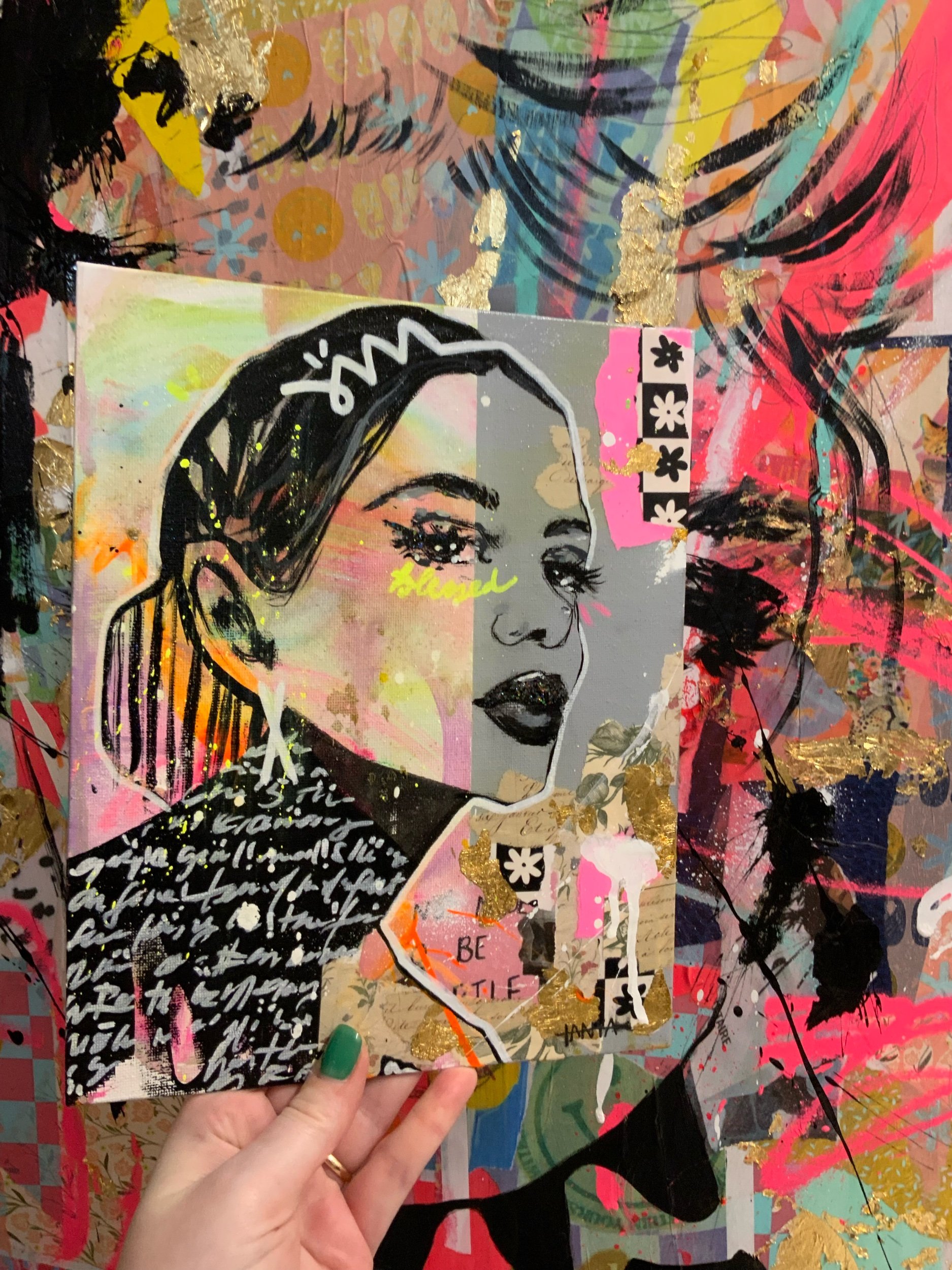 Mixed media and gold leaf. / Techniques mixtes et feuille d'or.